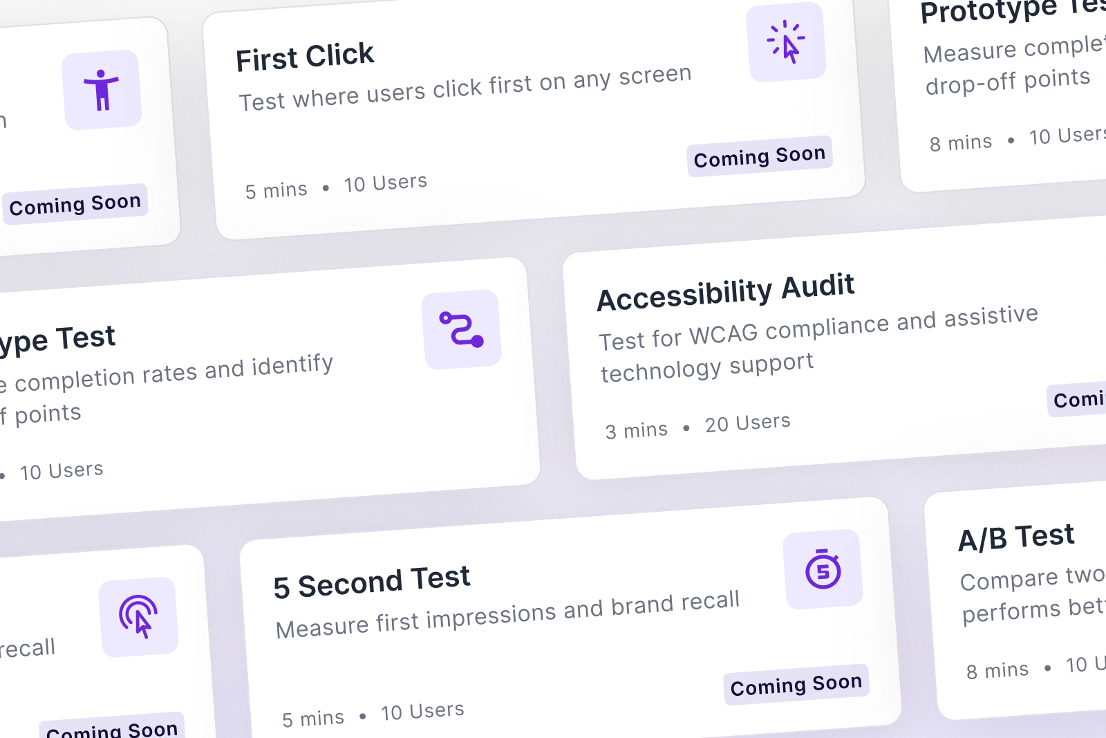 First impression tests, A/B comparisons, accessibility audits, and navigation tests. Coming soon...